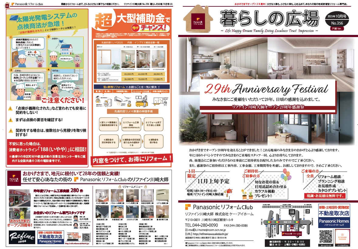 暮らしの広場とは…弊社オリジナルの情報チラシ。毎月/10,000部を観音・藤崎・池上新町・川中島・大師駅前・伊勢町・四谷上町・四谷下町・台町・昭和町・中島・大島・渡田・渡田新町・中瀬・塩浜・東門前・出来野・日ノ出・殿町・旭町・境町・追分町・鋼管通・田島町の地区のお宅に一軒一軒配布させて頂いております。